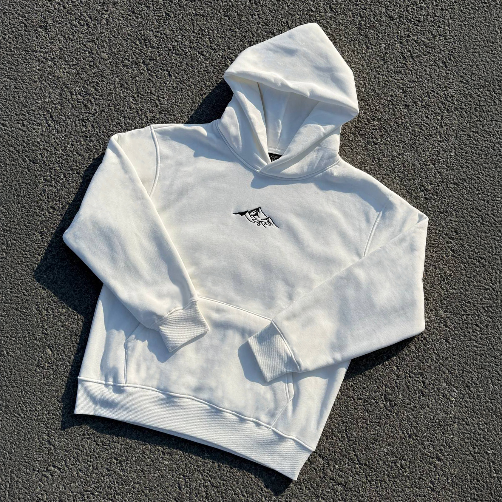 The white edition of our premium hoodie is defined by clarity and precision. Crafted from heavyweight fabric with a soft fleece interior, it offers structured comfort in a clean, modern silhouette. The chest features our signature mountain emblem, sharply embroidered in black for a refined, high-contrast finish.